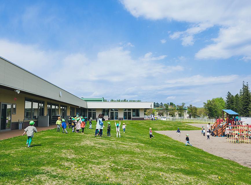 緑鮮やかな芝生が一面に広がる園庭で、こどもたちは自由に駆け回り、のびのびと過ごします。 夏は水遊び、冬は雪のソリ滑りなど、季節を感じる遊びが充実しており、築山や広い砂場など、こどもたちの「やってみたい!」を刺激する仕掛けがたくさんあります。 解放感あふれる広い遊戯室やきれいな園舎も木の香りが心地よく、毎日こどもたちの笑い声が響き渡ります。
