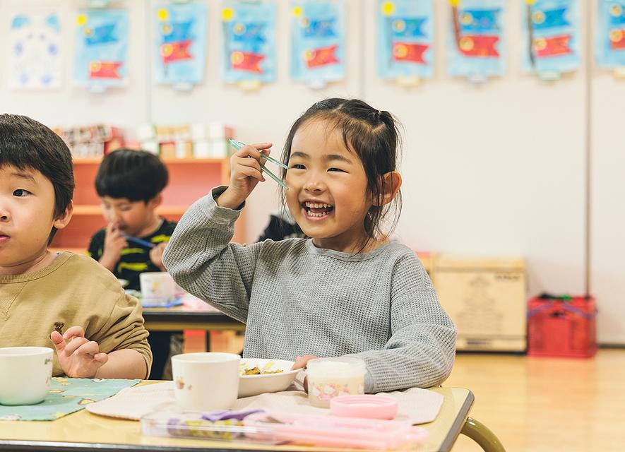 こども園の給食は、“手作り”と地元・清水産の食材にこだわった特別なもの。 化学調味料は一切使わず、カレーも小麦粉から丁寧に手作り。 アレルギー対応として米粉を取り入れるなど、細やかな工夫が光ります。 時には苦手だった食べ物も思わず完食してしまうほどのおいしさ。 園内にはその日の給食見本が並び、献立を目で見て楽しみながら、地域の豊かな恵みとたっぷりの愛情を五感で味わうことができます。