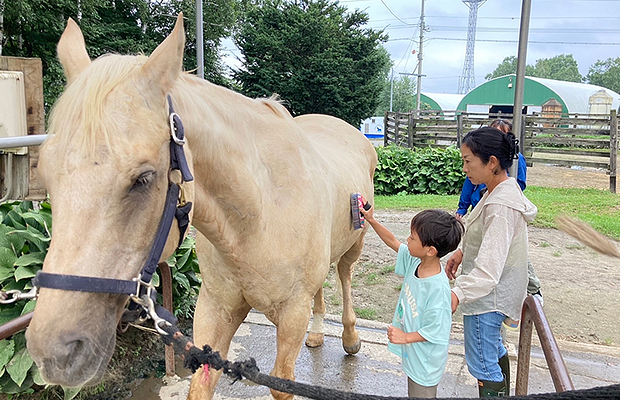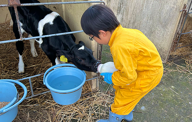 保育園留学で訪れたこどもたちに大人気の西山牧場。オーナーの西山さんの気さくな人柄も魅力です。乳しぼり・エサやり・子牛の哺乳ができる、ここでしかできない特別な酪農体験。こども用のつなぎや長靴も完備されており、本物の動物と触れ合える貴重な体験が待っています。