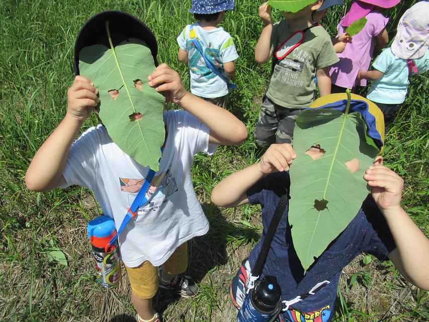 外に出ると、頭上にはたくさんのトンボが飛び交い、足元にはバッタやダンゴムシ。園庭には畑と木々が生い茂り、虫と野花の宝庫です。そんな自然の中に日常的にいることで、こどもたちはいつの間にか虫が好きになり、臆せずたくさんの虫や野花に手を伸ばしてふれあうようになっていきます。