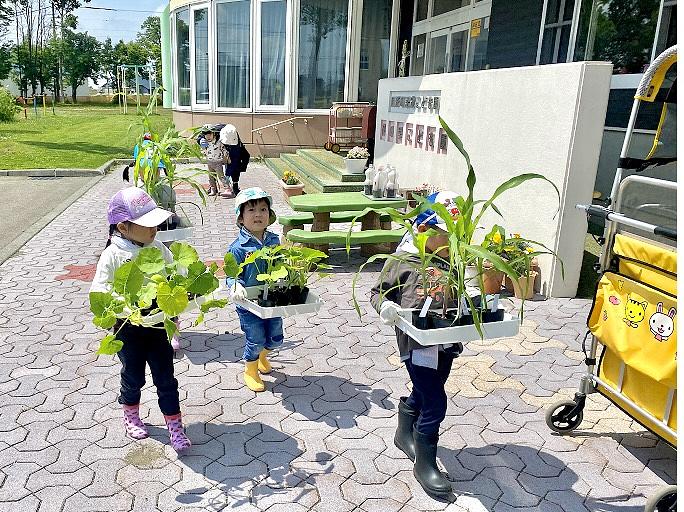 花の里こども園で過ごすこどもたちには、何かひとつでも「好きなこと」を見つけてもらいたいと思っています。そのため、豊かな自然の中で体を動かすことはもちろん、室内で工作したり、歌をうたったり、和太鼓や園芸をしてみたり、さまざまなことを少しずつ体験できるように、日々の活動を決めています。なんでも臆せず試してみることで、自分の興味に気づき、それを伸ばしていってもらえたら。保育士たちはそれを見守っています。 少人数なので、年齢を越えて仲が良いのも、園ならではの魅力。これは月形町に住む人の雰囲気にも通じていることですが、人懐っこく、新しい仲間にもフレンドリーです。小さな町ならではの温かい雰囲気を感じながら、楽しく過ごしてもらえたら嬉しいです。