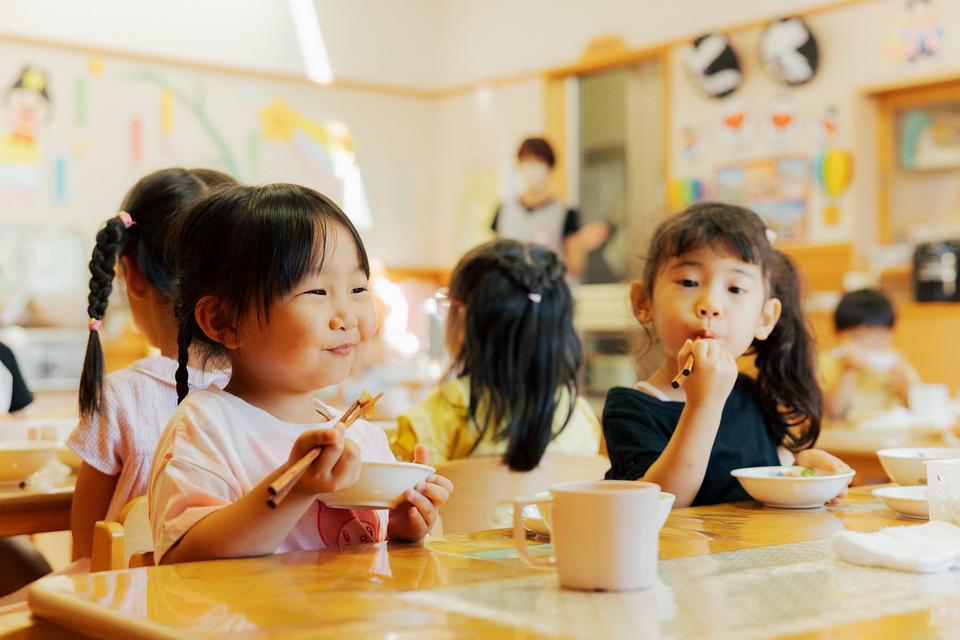 県内でも有数の「米どころ」にあるため、給食はほぼ毎日米食。地元の自然栽培米などが炊きたての状態で提供され、皆で「ふ〜ふ〜」しながら食べる時間は、みんなが笑顔!お米本来の豊かな味わいが味覚を育みます。