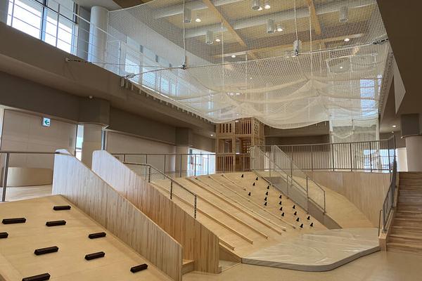 室内では基本的に裸足で活動。室内は能登ヒバやかば桜などの木材が使われており、足裏でやさしい木の質感を感じながら、指先にしっかり力を入れて歩いたり運動したりすることで体の「土台」を鍛えます。