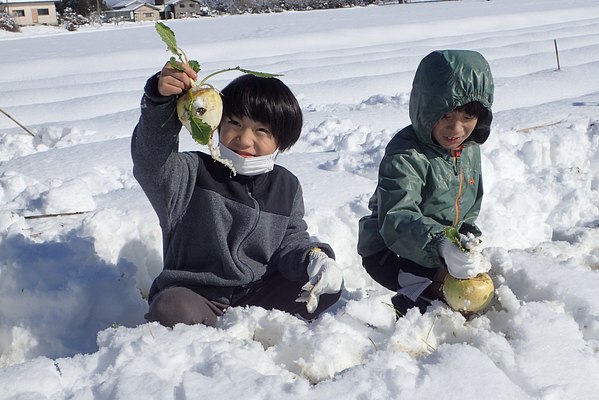 伝統料理の「かぶら寿司作り体験」も人気です。雪に埋もれている”大きなかぶ”を引っこ抜き、薄くスライスしたかぶとお魚を麹に漬けて作ります。