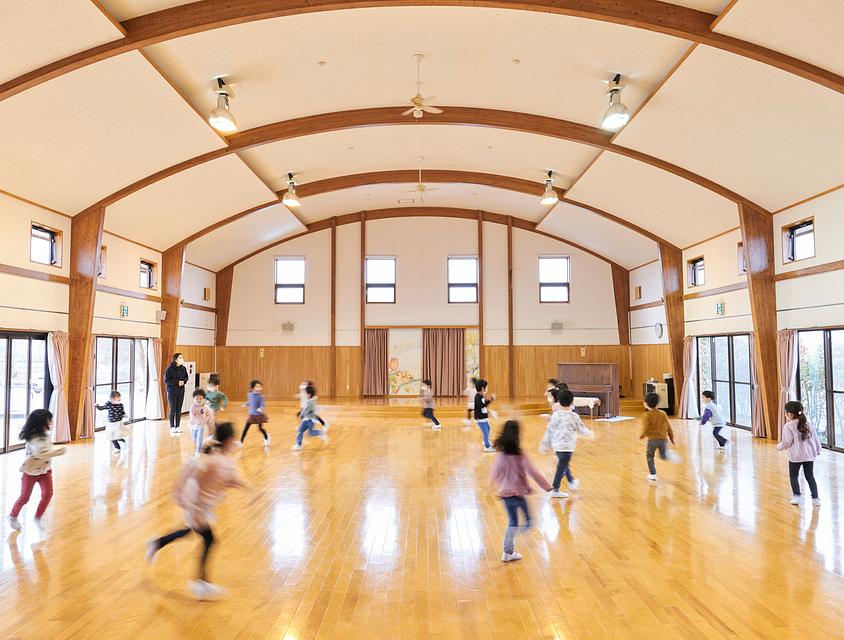 園児たちがのびのび遊べる遊戯室は、木を豊富に使い、天井を高く設計することで光を取り込み、室内にいながらも屋外のような開放感を感じられる空間に仕上げています。