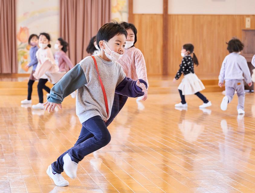 広々した園庭で、こどもたちは毎日からだを思いきり動かしています。「生活ミナオスレンジャー」という取り組みを行っており、夜早く寝て、朝ご飯を食べる。こうした基礎的な生活リズムが整っているかを確認します。