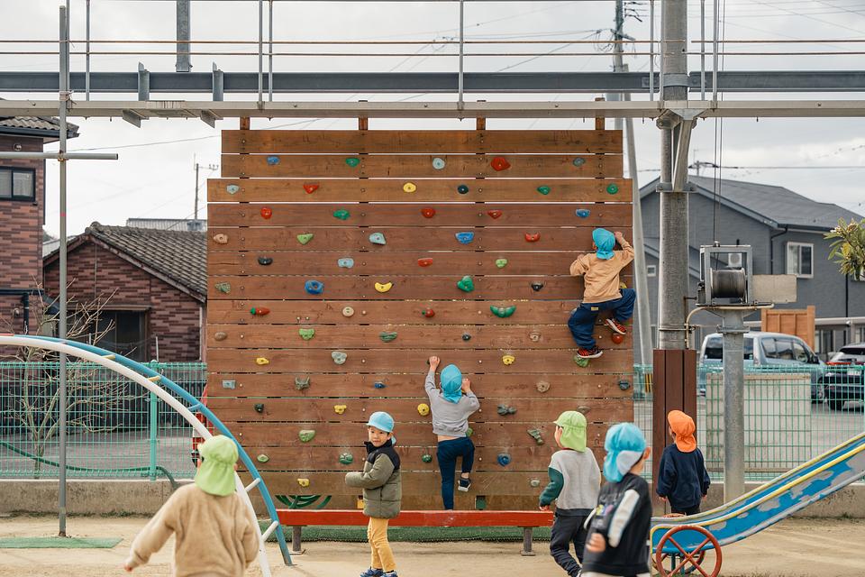 ボルダリングやヤグラなど園オリジナルの遊具が充実。職員は危険な時だけ手助けをし、遊び方はお友だちの真似をしながら習得します。園庭の一部には遮光ネットを設け、日差しが強めの日でも外で遊べるよう配慮。こどもの自由な発想と自主性を尊重し、こころから「楽しい!」と思える時間を提供します。