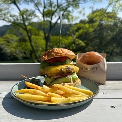 清流宮川を眺めながらいただくグルメバーガーと、ふわもち食感に仕上げたお土産にもびったりの熟生(じゅくなま)ドーナツが絶品。晴れた日には、宮川と大自然を一望できるテラス席をぜひ利用して!