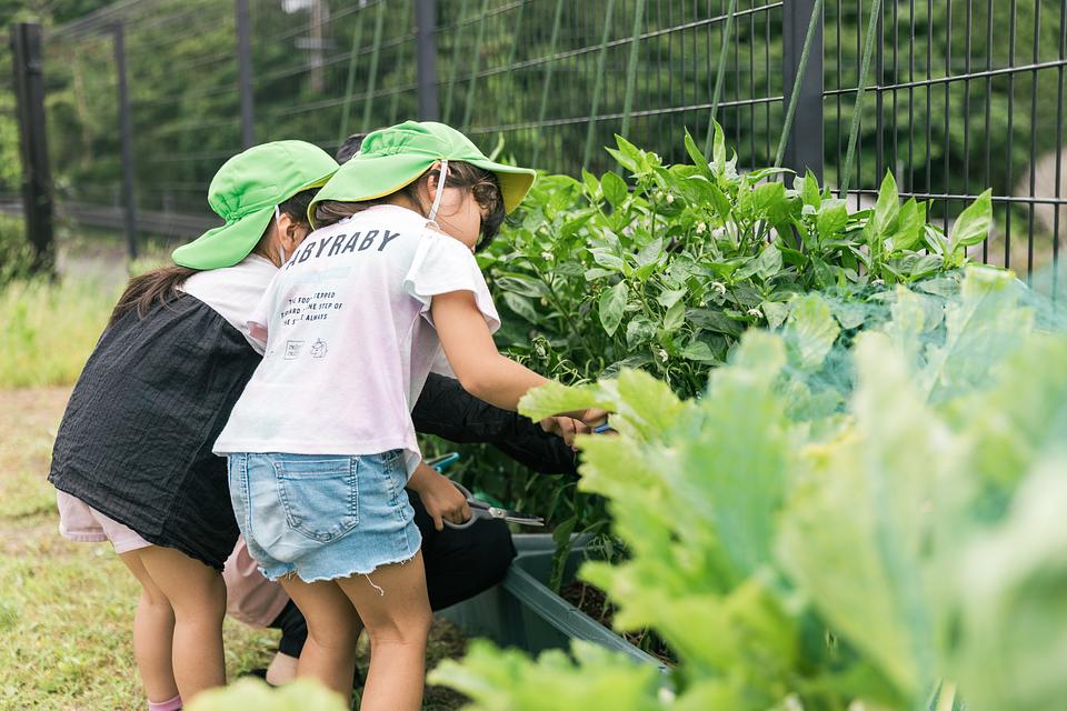 園内にある菜園では、たくさんの旬の野菜がぐんぐん成長中!年長児が収穫したピーマンは年下のクラスにもおすそわけ。「どんな香り?」「かたいんだね!」「つるつるしてる!」と五感で確かめる体験が、「食べてみたい!」気持ちを後押しします。